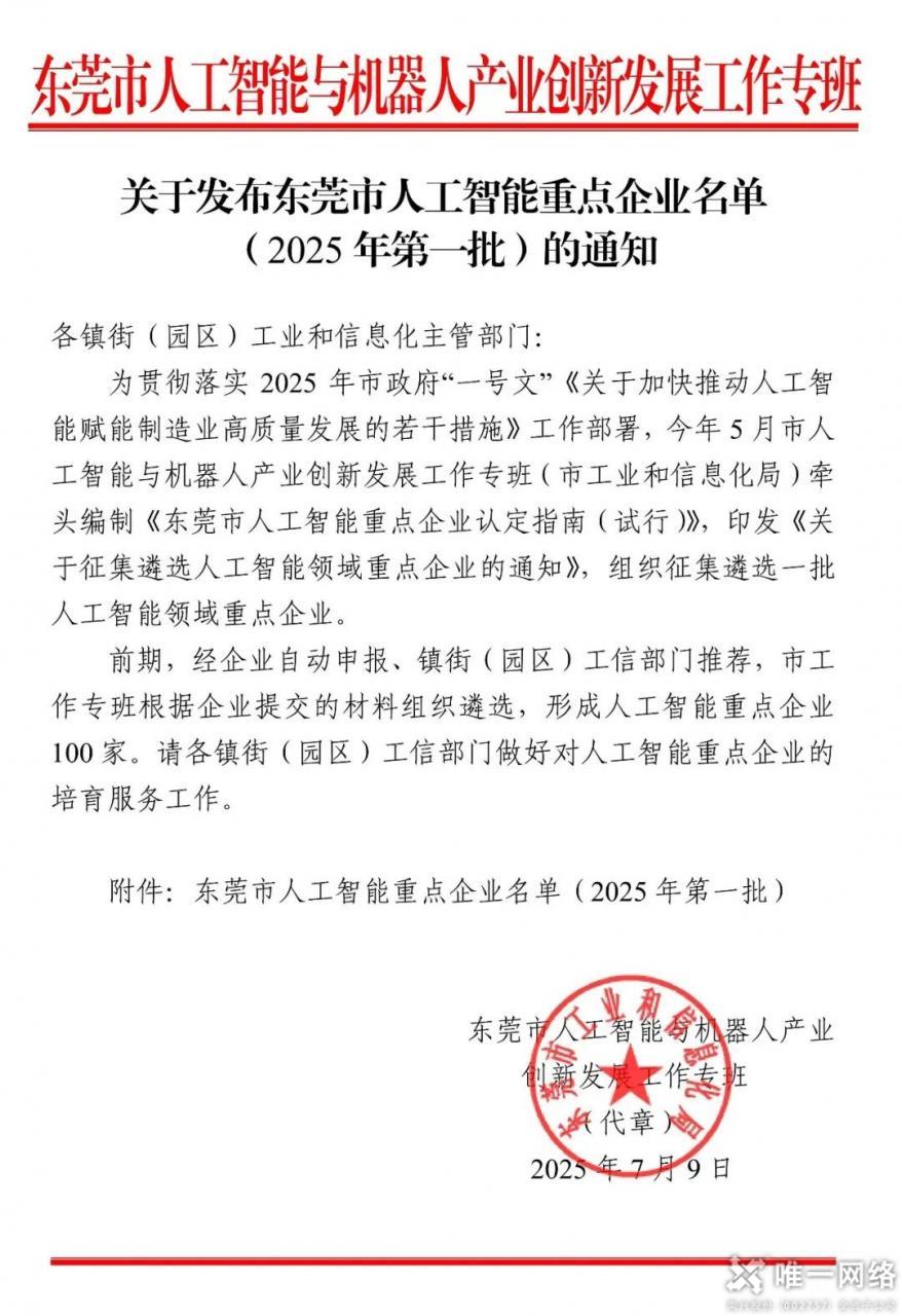 近日,東莞市人工智能與機器人產業創新發展工作專班正式發布《東莞市人工智能重點企業名單(2025 年第一批)》,唯一網絡憑借在人工智能領域的戰略布局、技術積淀與產
